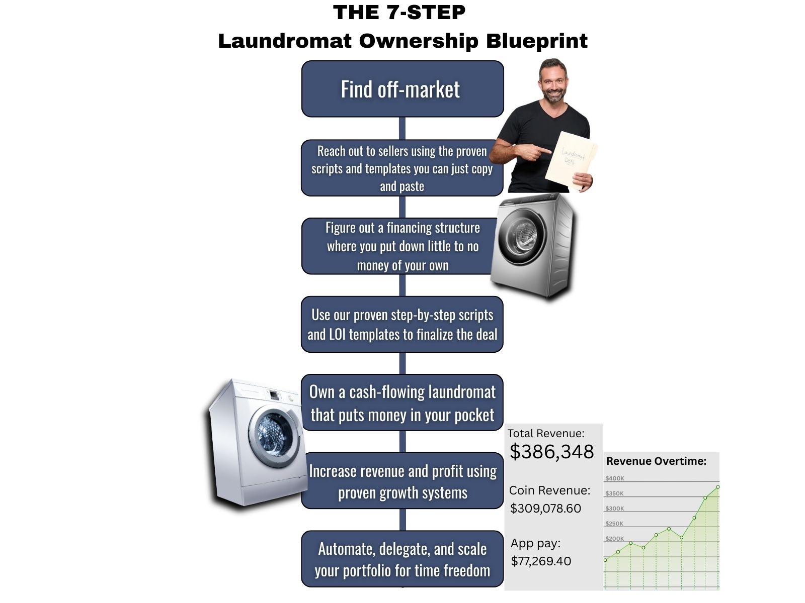 How to find & creatively finance your first laundromat with as little as $5,000 out of pocket by using Creative Financing and following a 3 step process that I've taught to over 2000 students using my blueprint.