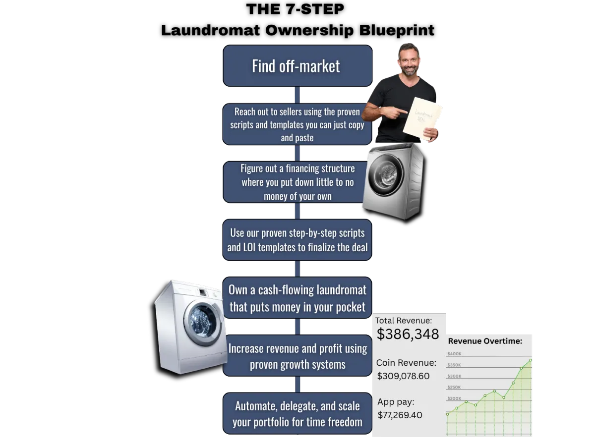 How to find & creatively finance your first laundromat with as little as $5,000 out of pocket by using Creative Financing and following a 3 step process that I've taught to over 2000 students using my blueprint.